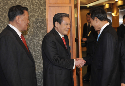 이명박 대통령이 대통령에 당선된 직후인 2007년 12월28일 전경련에서 열린 경제인간담회에 참석해 이건희 삼성회장과 악수를 하고 있다. ⓒ연합뉴스