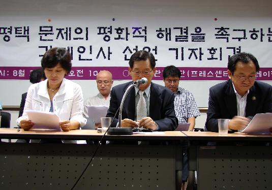 각계인사들은 이날 오전 서울 중구 프레스센터 7층 환경재단 레이첼카슨룸에서 열린 기자회견에서 “대다수 국민들은 평택 갈등의 대화를 통한 평화적 해결을 간절히 바라고 이있다”며 “정부와 주민대책위, 평택범대위 양자가 문제의 진정한 해결을 위해 입장변화를 전제로 한 허심탄회한 대화를 시작해야 한다”고 주문했다.
