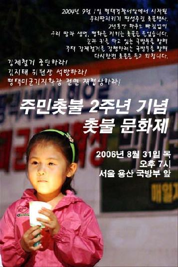 이에 앞서 평택범대위는 31일과 9월 1일, 이틀에 걸쳐 ‘주민촛불 2주년 문화제’를 서울 용산 국방부 앞과 평택 대추리에서 진행한다.