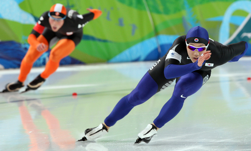 밴쿠버 동계올림픽 스피드 스케이팅 500M 1차전에서 모태범이 질주하고 있다. 1차전에서 2위를 기록했던 모태범이 2차전에서는 금메달을 차지하는 이변을 일으켰다. ⓒ연합뉴스