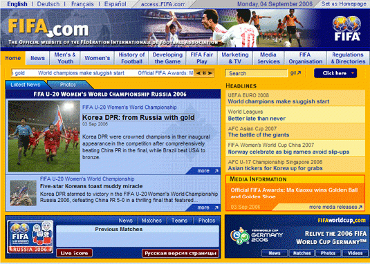 지난 4일 오전(이하 한국시간) 러시아 모스크바의 로코모티브 경기장에서 막을 내린 2006 19세 이하 여자청소년축구선수권대회 결승전에서 북한 대표팀은 김성희의 해트트릭에 힘입어 중국을 5-0으로 대파하고 우승을 차지했다.