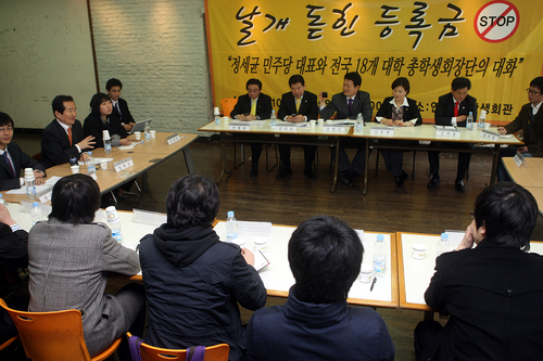 민주당 정세균 대표를 비롯한 의원들이 5일 연세대 학생회관에서 열린 18개 대학 총학생회장단 대학 등록금 관련 간담회에서 학생들과 대화하고 있다. ⓒ연합뉴스