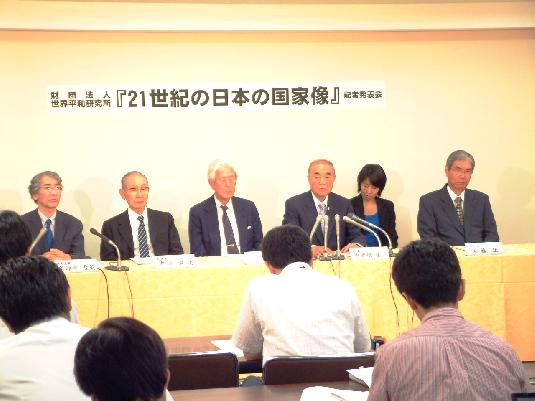 나카소네 야스히로(오른쪽에서 세번째) 전 일본총리가 5일 도쿄(東京)에서 기자회견을 갖고 '21세기 일본의 국가상에 관해'라는 제목으로 세계평화연구소의 대정부 제언을 발표하고 있다. ⓒ 세계평화연구소