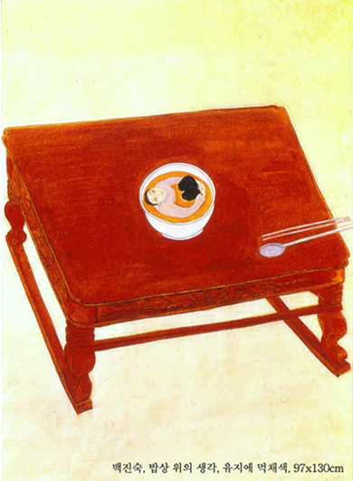백진숙은 그렇게 밥 한 끼를 먹을 때마다 이런저런 생각에 부침했던 모양이다. 기이한 낯섦이 부스스하게 일어나며 환상과 현실이 뒤섞여 있는 백진숙의 이 그림은 흥미로운 상상력과 유희가 얽혀 하나의 문장을 이룬다. 채색화로 그려진 이 동양화는 거울에 비친 자화상이 아니라 국그릇에, 죽 그릇에 빠진 자신의 몸을 위에서 내려다 본 구도 아래 조망한다. 그 모습이 더없이 처량하고 궁상스럽다. 작가는 밥을 먹다가, 밥상을 내려다보다 문득 이 장면을 상상했고 이를 빌어 환상적인 세계를 그려 보였다. 작가의 그림은 꿈꾸기, 몽상과 상상의 유희 아래 서식한다. 그렇게 그녀는 현실과 환상 사이를 번갈아 미끄러진다.