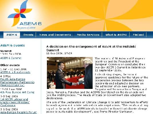 원자바오(溫家寶) 중국 총리와 고이즈미 준이치로(小泉純一郞) 일본 총리가 ASEM 회의장에서 악수한 장면을 초기 화면에 올린 ASEM 공식 홈페이지 ⓒ ASEM