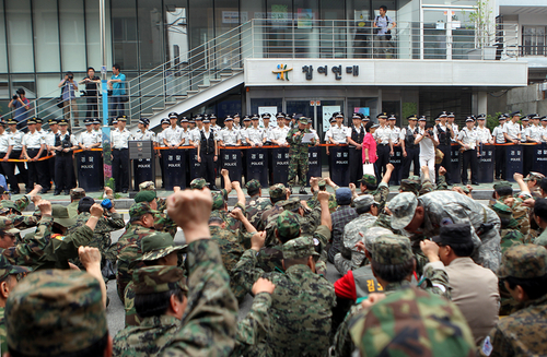 군복을 입은 극우단체 회원 200여명은 이날 오전 서울 통인동 참여연대 건물 앞에서 "북한이 서울을 불바다로 만들겠다고 협박하지만 우리는 참여연대 너희들부터 불바다를 만들 것"이라는 플래카드를 앞에 내걸고 "국민의 등에 칼을 꽂은 반역자는 처벌하라" 등의 구호를 외치며 비난집회를 가졌다.