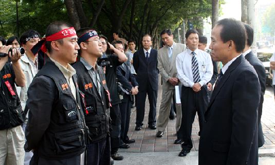19일 오후 서울 도곡동 EBS 사옥 앞에서 구관서 신임사장과 최준근 감사가 노조원들과 대치하고 있다.ⓒEBS노동조합