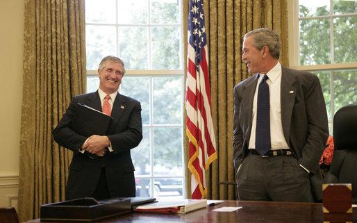 앤드류 카드 전 백악관 비서실장이 부시대통령에게 럼즈펠드 장관의 교체를 요구했으나 묵살당하자 사임했다는 주장이 제기됐다. 사진은 백악관 집무실에서 부시대통령과 카드 전 실장이 대화를 나누고 있는 모습ⓒ백악관