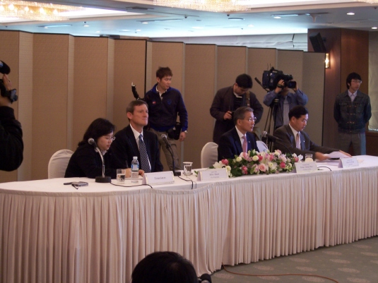 강정원 국민은행장과 엘리스 쇼트 론스타 부회장이 23일 서울 영등포구 여의도동 63빌딩에서 외환은행 인수 우선협상대상자 선정 관련 기자회견을 갖고 있다. ⓒ 김홍국 기자