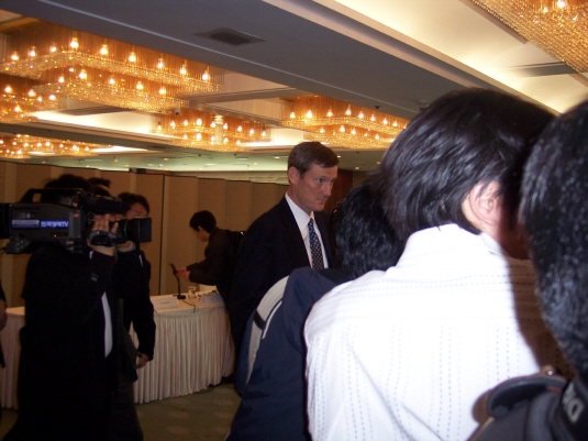 엘리스 쇼트 론스타 부회장이 기자회견 후 질문을 위해 몰려드는 취재진을 바라보고 있다. ⓒ 김홍국 기자
