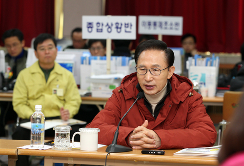 이명박 대통령이 16일 강원도 횡성군 횡성군청을 방문해 관계자들과 간담회를 하고 있다. ⓒ연합뉴스 구제역은 축산업 자체를 붕괴 위기에 몰아넣는 동시에, 눈앞 현실로는 공급량이 격감하면서 소·돼지 값을 폭등케 하고 있다.