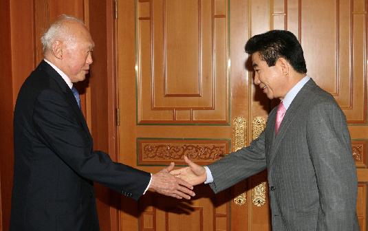 지난 5월 방한해 노무현대통령과 만나고 있는 리콴유 싱가포르 선임장관. 노대통령은 리 선임장관으로부터 부동산정책의 노하우를 전수받았어야 했다. ⓒ연합뉴스