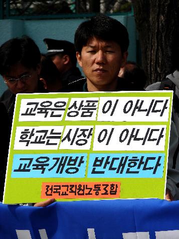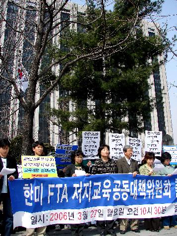 전교조, 참교육학부모회, 교수노조 등 교육분야 21개 시민사회단체로 구성된 ‘한미FTA 저지 교육분야 공동대책위원회(공대위)는 27일 오전 광화문 정부종합청사 앞에서 출범 기자회견을 열고 “FTA 협상에 따른 교육개방은 사회양극화로 심화되고 있는 교육 불평등을 심화시킬 것”이라며 한미 FTA 협상 중단을 촉구했다.