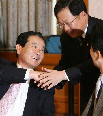 박병원 재경차관이 강봉균 열린우리당 정책위의장을 만나 파안대소하고 있다. 이들은 '모피아'라는 공통점을 갖고 있다. ⓒ연합뉴스