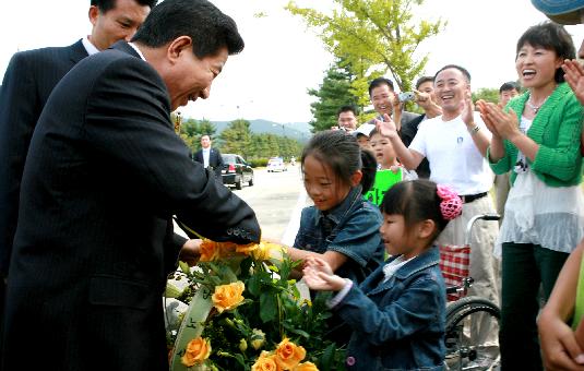 노사모 회원들로부터 환갑 축하 꽃다발을 받고 기뻐하는 노무현 대통령. 그러나 일부 노사모의 불변없는 다과회 녹취 및 유포로 곤경에 몰리고 있다. ⓒ연합뉴스