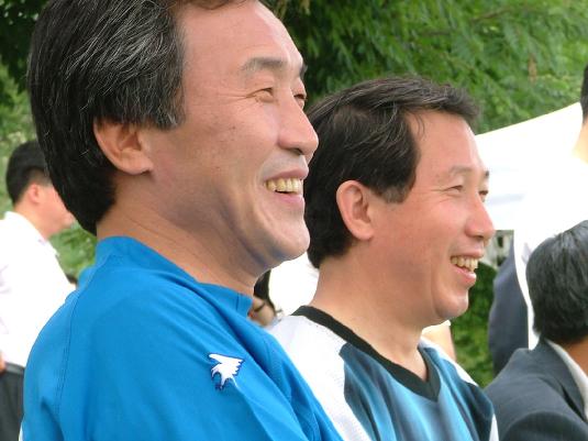 한 축구모임에서 같이 공을 찬 뒤 파안대소하고 있는 김근태-손학규. 현재는 여야로 소속을 달리하고 있으나 과연 민주화운동을 같이 하는 등 두사람 사이에는 공통분모가 많다는 평가를 받고 있다. ⓒ연합뉴스