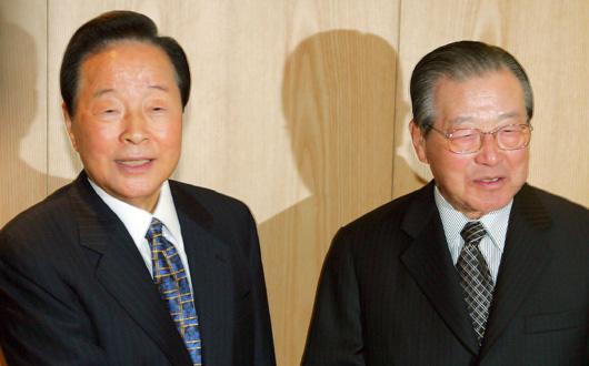 김영삼 전 대통령과 김종필 전 자민련 총재가 30일 저녁 서울 신라호텔에서 만찬회동을 갖기에 앞서 포즈를 취하고 있다. 김대중 전 대통령과 함께 이른바 `3김'(三金)으로 불렸던 두 정객이 단독으로 만나는 것은 지난 2004년 17대 총선 이후 2년여만이다. ⓒ연합뉴스
