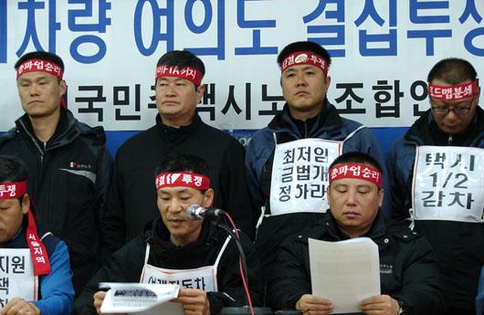 구수영 민주택시연맹 위원장은 “정부에 수년에 걸쳐 최저임금에 못 미치는 저임금과 살인적인 근무량을 해소할 제도 개선을 요구했지만 철저히 외면당해왔다”며 “이제는 더 이상 극단적인 방법이 아니고서는 택시문제를 해결할 수 없다는 절박한 심정으로 투쟁을 선택했다”고 말했다.