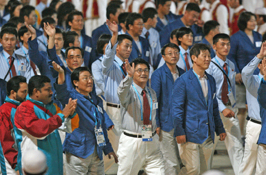 영문 알파벳 순서에 따라 아프가니스탄 선수단이 가장 먼저 입장했고 한국은 카자흐스탄에 이어 16번째로 입장하며 예정대로 남북의 선수단이 함께 경기장에 들어섰다. 공동기수인 남측의 이규섭, 북측의 리금숙이 한반도기를 들고 선수단 맨 앞에 섰고, 파란 자켓을 걸친 한국선수단과 하늘색 셔츠를 입은 북한선수단은 한데 어울려 경기장으로 입장하며 '화합의 한민족'임을 과시해 관중들의 뜨거운 박수를 이끌어냈다.