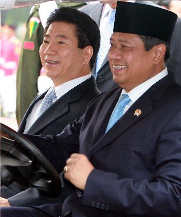 당원에게 보내는 편지로 열린우리당을 발칵 뒤집은 노무현 대통령이 수실로 밤방 유도요노 인도네시아 대통령과 함께 4일 오전 자카르타 대통령궁에서 공식환영식을 마친 뒤 함께 골프카를 타고 정상회담장으로 향하고 있다.ⓒ연합뉴스
