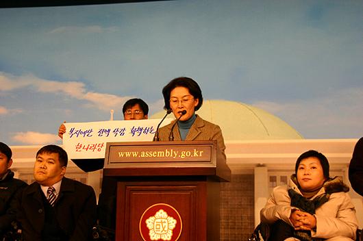 현애자 민주노동당 의원과 장애인활동가들이 11일 국회 브리핑룸에서 한나라당의 복지예산 삭감을 규탄하는 기자회견을 열고 있다.ⓒ현애자 의원실