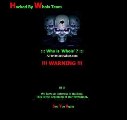 화면 상단에는 "후이즈 팀에 해킹당했다"는 영문과 함께 머리에 총을 맞은 세개의 해골 그림이 그려져 있었다.