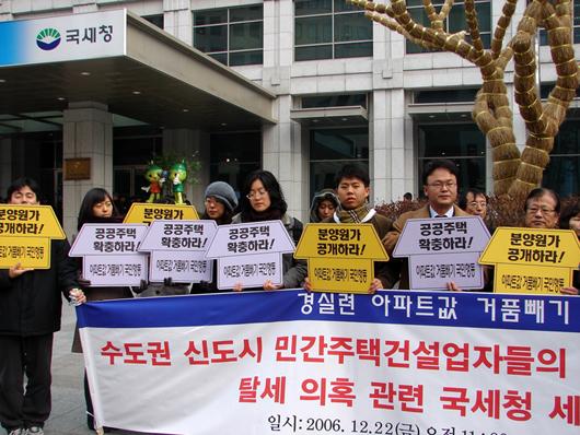 경실련은 22일 오전 서울 종로구 청진동 국세청 앞에서 기자회견을 갖고 2000년부터 수도권 신도시에서 택지비 부풀리기로 1조3천억원의 폭리를 취한 74개 업체에 대한 세무조사를 국세청에 의뢰했다.ⓒ최병성 기자